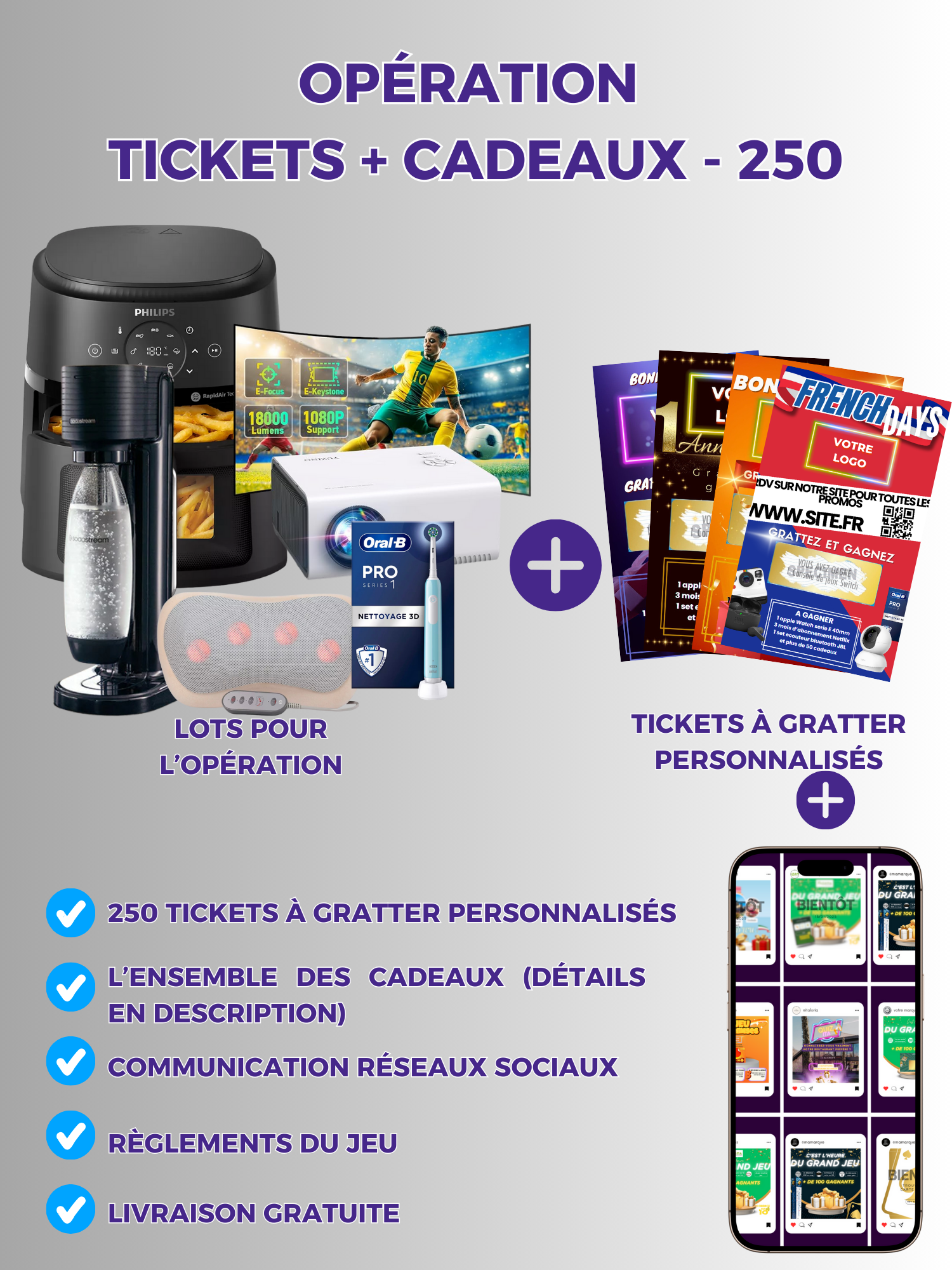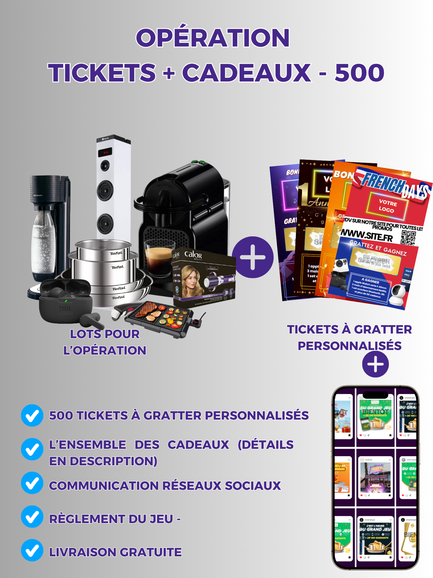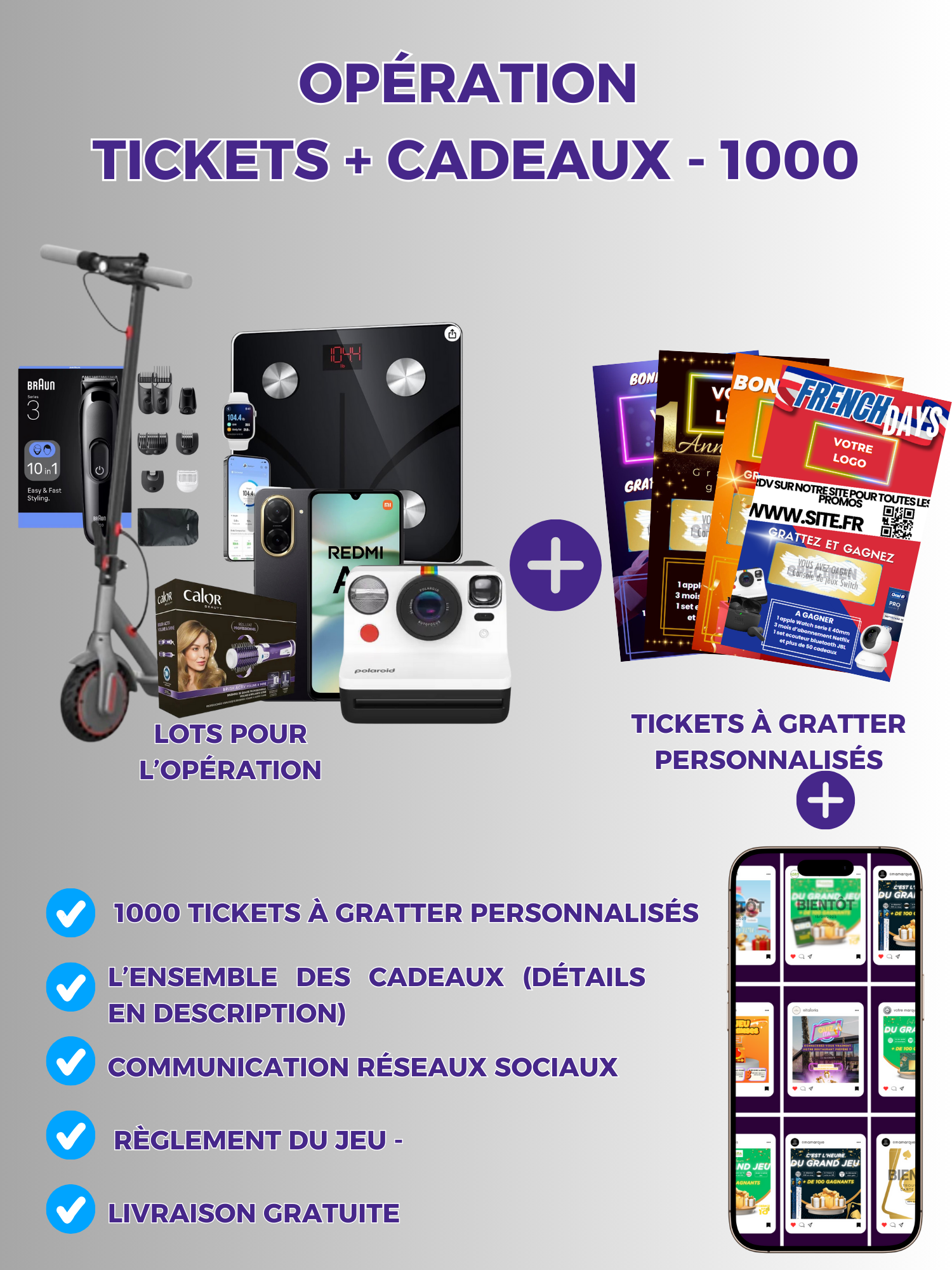 Recevez le pack complet, comprenant les cadeaux de votre jeu concours ainsi que les tickets à gratter.