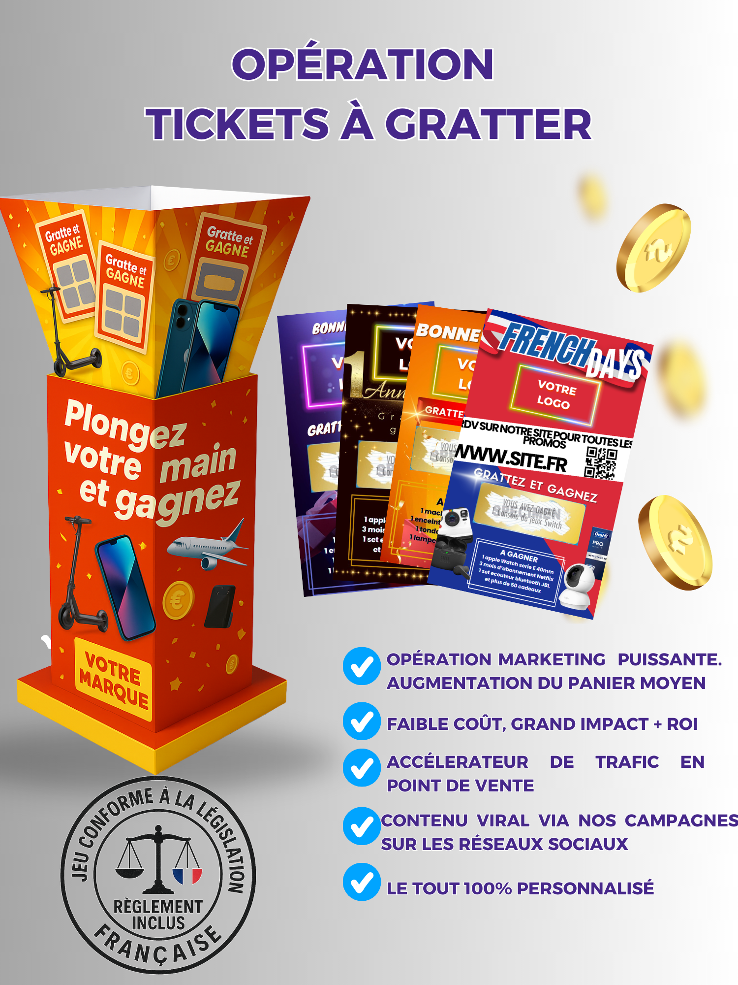 Votre ticket à gratter personnalisé est conçu 100% à vos couleurs, avec votre logo et vos lots. À chaque passage en caisse, vos clients piochent un ticket à gratter personnalisé dans le présentoir et découvrent immédiatement s’ils ont gagné un lot ou une offre. Un ticket à gratter personnalisé clé en main qui génère l’effet waouh et fait revenir vos clients en magasin.